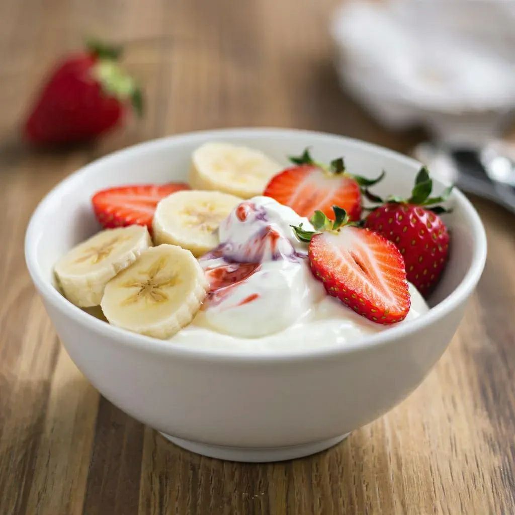 200 г натурального йогурта (120 ккал, 10 g белков, <1 g жиров, ~12 g углеводов)