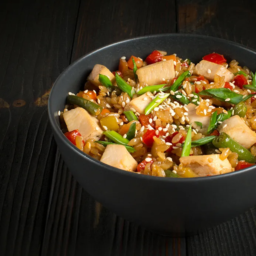 3. Смешайте рис с курицей и овощами.